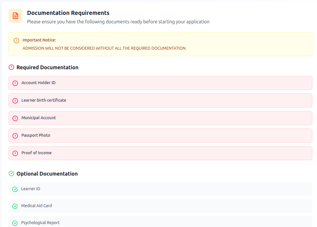 - Fully Custom Policy DocumentsSchools can define and publish their own policy documents that parents must review and agree to when applying for student placement. Ensures legal compliance and informed consent before enrolment is finalised.